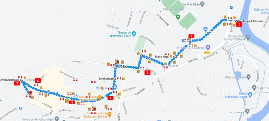 Vertrek vanaf bedrijventerrein De Drie Eiken - Tolweg - Frans Halslaan - Paulus Potterlaan - Johannes Vermeerlaan - Kerkstraat - Brinkstraat - Brink - Laanstraat - Nieuw Baarnstraat - Nieuwstraat - Laanstraat - Brink